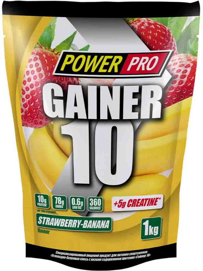 Gainer 10 от Power Pro — лучшая формула гейнера для тех, кто хочет увеличить объем мышечной массы, а не превратиться в бесформенную тушу из мяса и жира. В отличие от гейнеров большинства производителей, в гейнерах Power Pro минимальное количество жиров. Только трехкомпонетная матрица европейского протеина и натуральные чистые углеводы. Вспомогательными элементами для Ваших мышц и энергии выступают следующие компоненты: